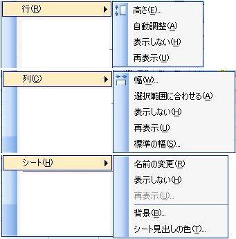 ・[セル]、[行][列]、[シート]はExcel2010では[ホーム]タブの[セル]グループの[書式]で選択します。