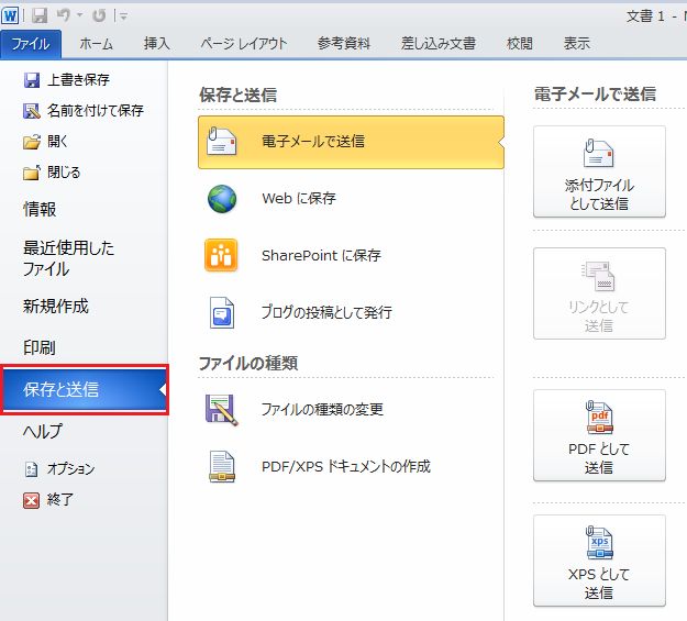 Word2010では [ファイル]タブを開いて[保存と送信]で選択、